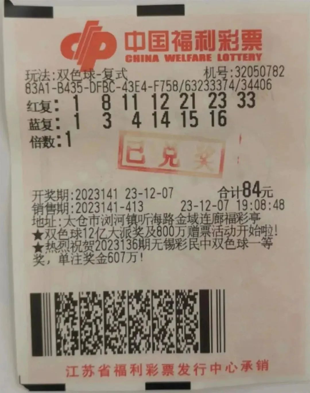 12月7日,双色球第2023141期游戏开奖,这是今年双色球12亿元大派奖活动的第十三期派奖。本期开奖红球号码为:1、8、11、12、21、23,蓝球号码为:3,全国一等奖共开出11注,单注奖金为752万余元,江苏省唯一的一注一等奖被苏州彩民老汪收入囊中。老汪采用7+6的复式投注方式,中得一等奖1注、二等奖5注、三等奖6注、四等奖30注和一等奖特别奖1注,奖金共计1120万多元。