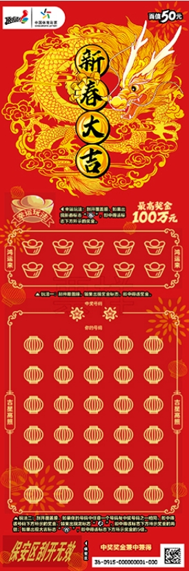 玩法一:刮开覆盖膜,如果出现奖金标志,即中得该奖金。 玩法二:刮开覆盖膜,如果你的号码中任意一个号码与中奖号码之一相同,即中得该号码下方所示的奖金;如果出现龙标志,即中得该标志下方所示奖金的两倍;如果出现大吉标志,即中得该标志下方所示奖金的5倍。 幸运玩法:刮开覆盖膜,如果出现新春标志,即中得该标志下方所示的奖金。 中奖奖金兼中兼得。