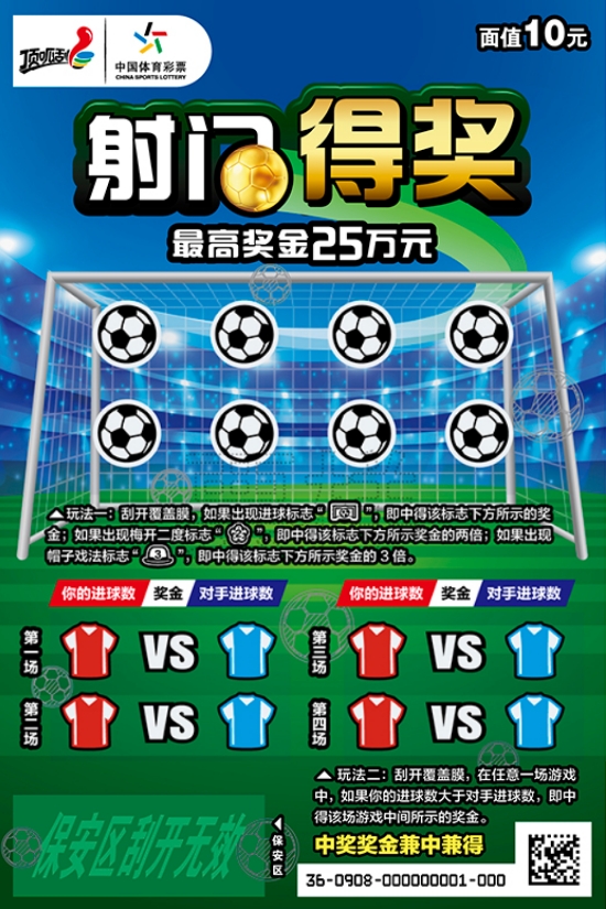 玩法一:刮开覆盖膜,如果出现进球标志,即中得该标志下方所示的奖金;如果出现梅开二度标志,即中得该标志下方所示奖金的两倍;如果出现帽子戏法标志,即中得该标志下方所示奖金的3倍。 玩法二:刮开覆盖膜,在任意一场游戏中,如果你的进球数大于对手进球数,即中得该场游戏中间所示的奖金。 中奖奖金兼中兼得。