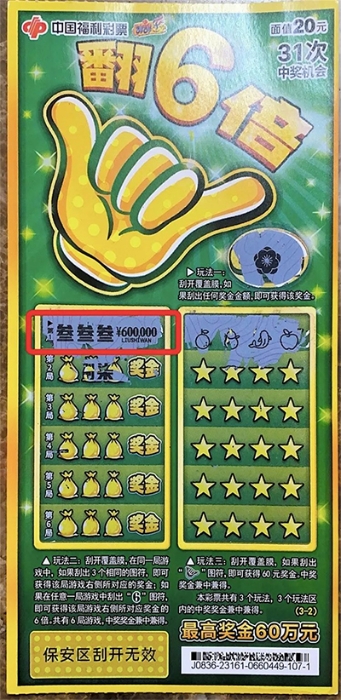 据了解,张女士20多岁,元旦假期和男友来重庆旅游。1月1日,假期最后一天,俩人逛街路过投注站时,男友便提议买几张刮刮乐试试手气,进店后张女士随手拿的一张彩票,中出100元奖金,“这是我第一次玩,觉得手气挺好就又随手挑选了一张。”仍有些激动的张女士说道,没想到第一行就刮中了60万元大奖。