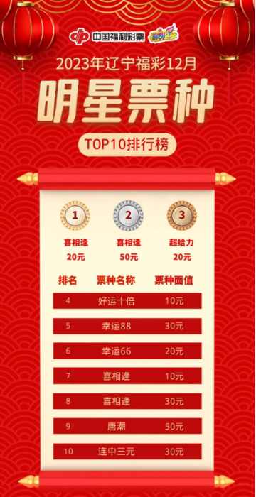 2023年12月辽宁福彩明星票种TOP10排行榜