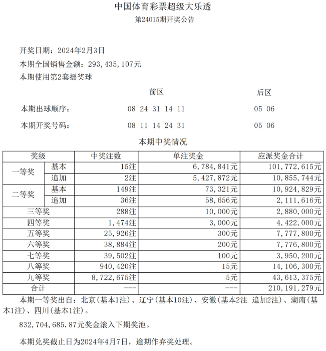 2月3日,体彩超级大乐透第24015期前区开出号码“08、11、14、24、31”,后区开出号码“05、06”。本期全国销量为2.93亿元,为国家筹集彩票公益金1.05亿元。