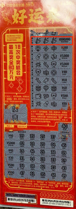 屈先生是福彩的忠实支持者,特别喜欢双色球和刮刮乐游戏。2月9日,除夕当天,屈先生陪同妻子外出购物时经过了刮刮乐卖场。为了打发时间,他决定购买几张刮刮乐娱乐,“我一眼就看中了‘好运来’,票面喜庆,名字也很吉利,特别适合为新年讨个好彩头。”购买的第一张并未中奖,没有尽兴的他决定再挑一张,中出30元奖金后,他又乘势刮了一张,没想到竟与80万元大奖不期而遇。