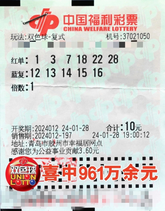 1月28日晚的双色球第2024012期开奖中,开出红球号码01、03、07、18、22、28;蓝球号码15。当期青岛喜中省内唯一1注头奖,单注奖金867万余元,花落胶州市幸福居网点的福彩37021050销售站。大奖得主钱先生凭借一张投注额10元的6+5自选复式票,不但将这1注头奖揽入怀,还同时中得了4注二等奖(单注奖金23万余元),总奖金合计9610173元。