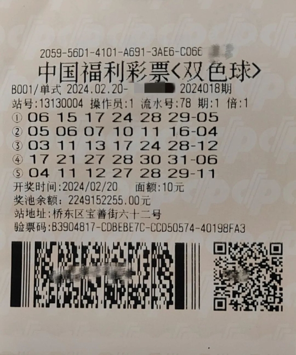 2月20日,双色球第2024018期,在张家口市公安局桥东分局报刊亭13130004号销售网点,购彩者王先生(化姓)凭借1张10元5注单式票中二等奖1注,单注奖金10.4万元。