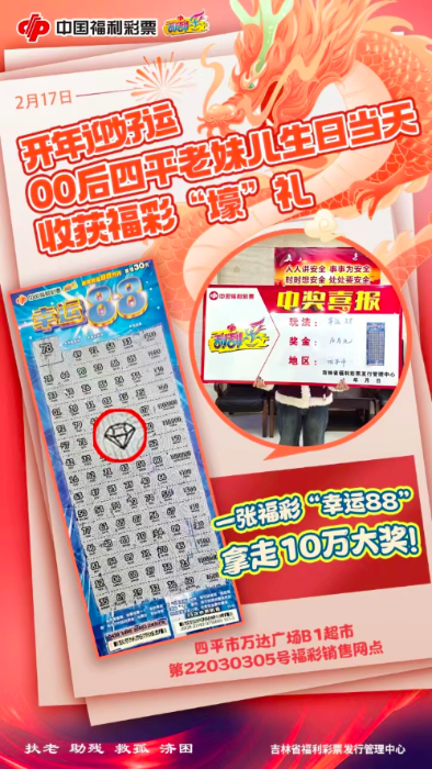 2月18日,四平市万达广场B1超市第22030305号福彩销售网点爆出大奖,该站00后购彩者小李(化姓)生日当天购买即开型福利彩票“幸运88”,喜中10万元大奖!