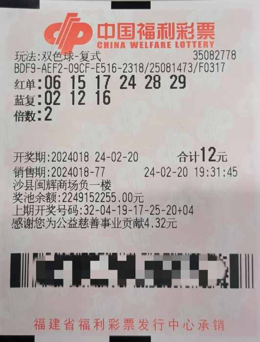 2月20日晚,福彩双色球第2024018期开奖,位于三明市沙县闽辉商场负一楼的福彩35082778投注站中出2注一等奖,单注奖金为707万多元。中奖彩票是一张2倍投注的6+3复式票,中得2注一等奖和4注二等奖,总奖金高达1457万多元。这是福建购彩者在甲辰龙年斩获的首个双色球一等奖!
