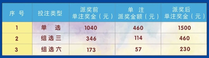 此次派奖不仅总金额超高达到了6500万元,参与的玩法更是单选、组选全部覆盖。其中,单选的单注奖金增加460元,从原来的1040元增加到1500元;组选三的单注奖金增加114元,从原来346元增加到460元;组选六的单注奖金增加57元,从原来173元增加到230元。若是倍投中奖,中奖金额翻倍。这力度,杠杠滴!