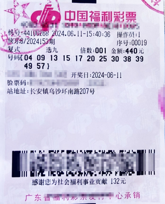 2024年6月11日,中国褔利彩票快乐8游戏第2024153期开奖,东莞长安镇44100268福彩销售站点售出的一张“选九”1倍复式自选彩票中得“选九”大奖,中奖奖金为320万元。