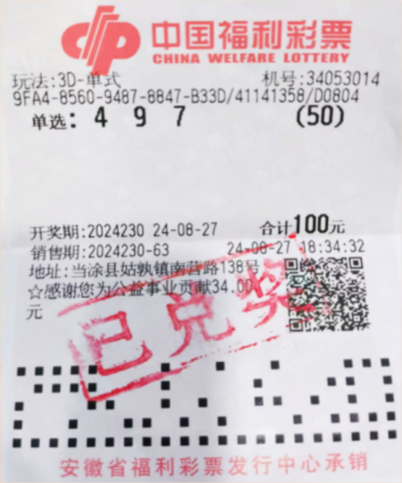 8月27日,3D游戏2024230期开奖,中奖号码4、9、7。马鞍山一彩民中得3D游戏单选大奖50注,奖金合计52000元。出奖站点是位于马鞍山市当涂县姑孰镇南营路138号的福彩34053014投注站。