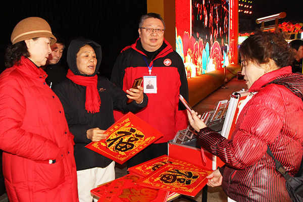 1月18日晚,月牙岛新春夜游记灯光秀隆重开幕,在这片光影交织的欢乐海洋里,抚顺福彩中心主任董晓威、副主任张鑫率领部分工作人员,开展“福彩赠票 幸运相伴冰雪季”活动。参与者在福彩宣传板前拍照发朋友圈,即可获赠一张面值10元的《耀出彩》彩票,还有春联、挂历等礼物相赠,将公益福彩的好运和温暖送到大家身边。