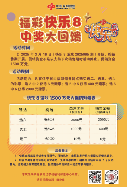 福彩“快乐8” 中奖大回馈赠票促销活动自2025年3月16日(快乐8游戏2025065期)开始,按销售期开展。促销资金不足以支持下次销售期时活动停止。