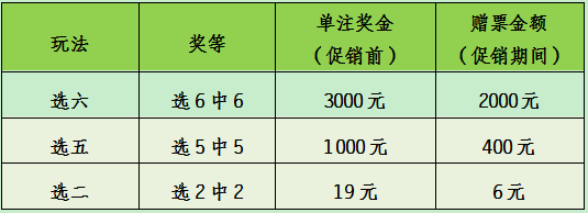 亮点三:3000+2000,谁与比肩。此次参与促销的是三种购彩者喜爱的明星玩法,其中赠票金额最高的就是选六中六玩法,投注方式是从80个号码里选6个号码进行投注,中出6个号码,单注奖金3000元,促销期间,只要您中得选六中六,获赠2000元彩票。选五中五玩法中1000元的同时,额外获赠400元彩票。选二玩法也紧随其后,拥有6元的赠票。