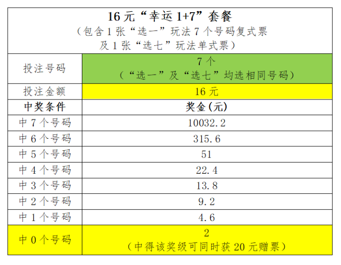 值得注意的是,采用“幸运1+7”套餐投注“更实惠”,该套餐投注金额为16元,包含一张“选一”玩法7个号码复式票及一张“选七”玩法单式票,只需选7个号码,中0至7个号码均有奖;且在活动期间,在一个号码都不中的情况下,将可获得一张价值20元的“选二”复式赠票,赠票最高奖金达190元,有机会体验连环中奖。