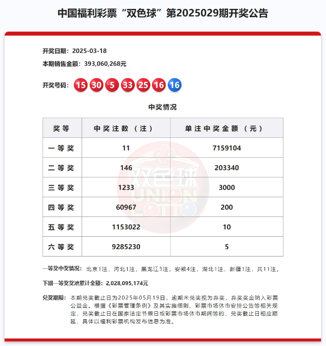 当期双色球一等奖中出11注,单注奖金715万元。大奖分落北京1注、河北1注、黑龙江3注、安徽4注、湖北1注、新疆1注。