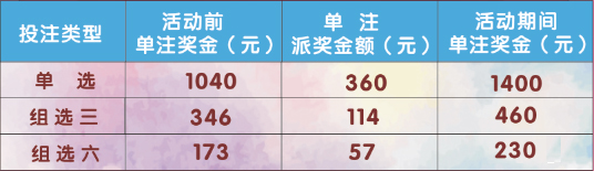 此次派奖参与的玩法单选、组选全覆盖。其中,单选的单注奖金增加360元,从原来的1040元增加到1400元;组选三的单注奖金增加114元,从原来346元增加到460元;组选六的单注奖金增加57元,从原来173元增加到230元。若是倍投中奖,中奖金额翻倍。这力度,杠杠滴!