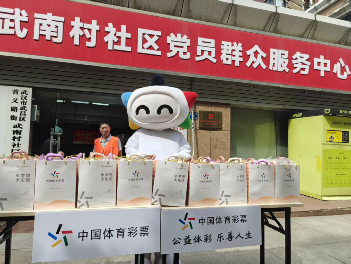 4月29日下午,位于武昌火车站附近的武南村社区党员群众活动中心门前热闹非凡。湖北体彩乐小星在社区里,为劳动者们送来了小风扇、水杯、冰丝防晒袖套等五一节好礼。