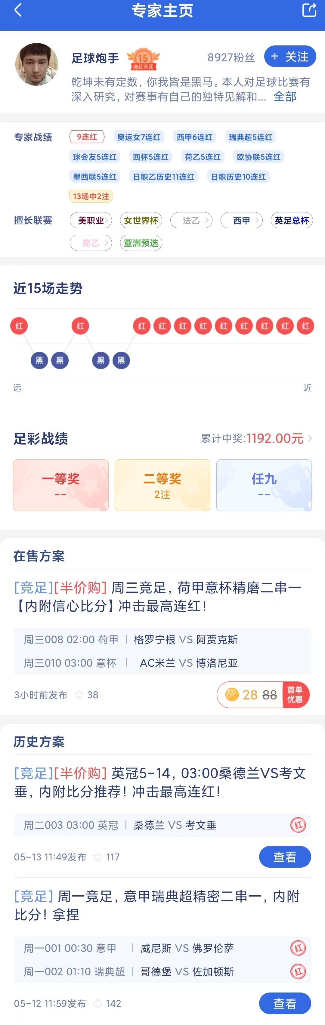竞彩专家“足球炮手”近期拿下9连红,稳定盈利中!今日带来2串1推荐,方案半价购,冲击11连红!