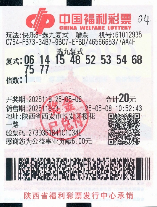 5月8日,快乐8第2025118期开奖,选十大奖轮空,开出“选九中九”2注;其中一注,出在陕西西安。