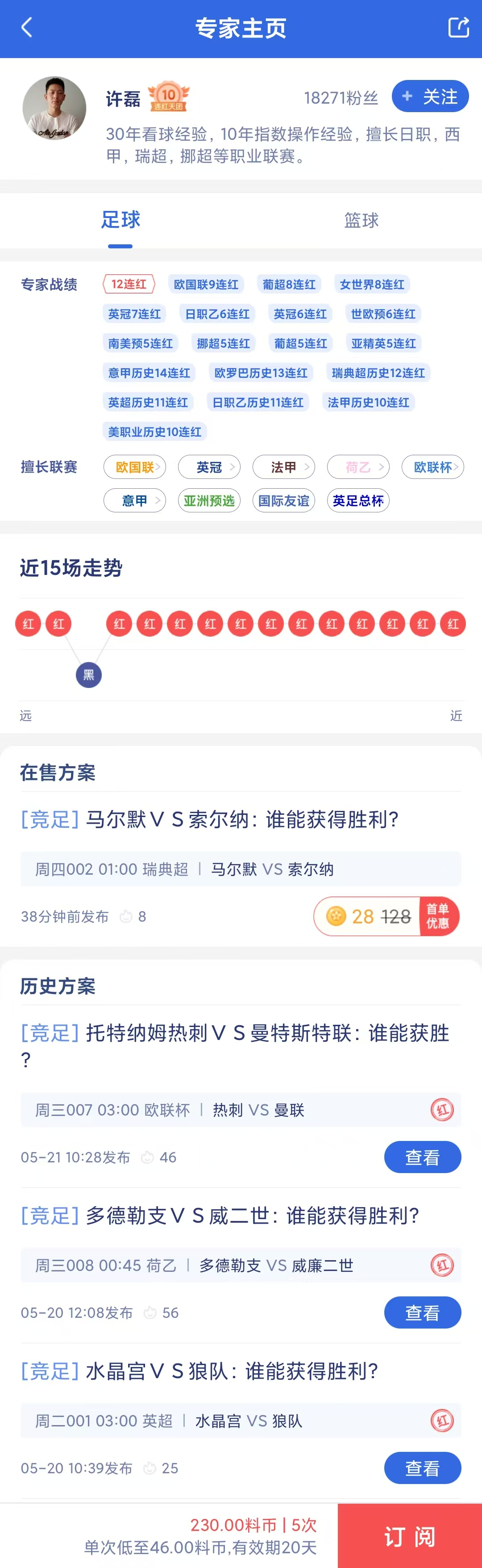 竞彩专家“许磊”近期状态爆棚,豪取12连红!今日精选方案已更新,订阅看方案更优惠,快来查看!
