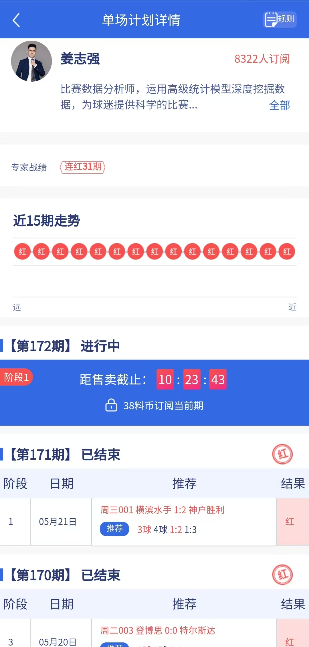 单场计划专家“姜志强”连续两期计划均精准命中比分,目前连红31期!今日最新计划已更新,冲击32连红!