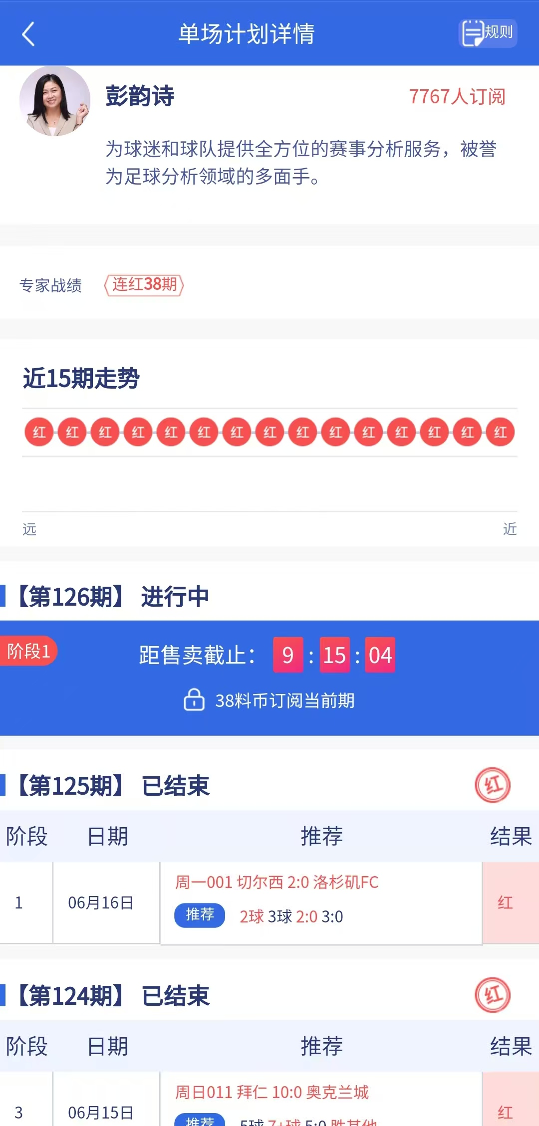 单场计划专家“彭韵诗”再次命中世俱杯切尔西2-0的比分,目前连红38期!今日最新计划已更新,冲击29连红!