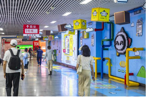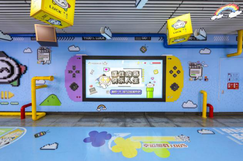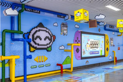 走近大东门站体彩品牌专区,将瞬间穿越回那个充满怀旧与挑战感的像素游戏时代!整个专区以 经典像素艺术风格 精心设计,搭配多巴胺配色的管道,色彩明快跳跃,营造出强烈的视觉吸引力和沉浸感。灵感汲取自经典游戏的闯关元素,巧妙设计成多道“关卡”,乘客不再是匆匆过客,而是化身“闯关者”,提高宣传的趣味性!