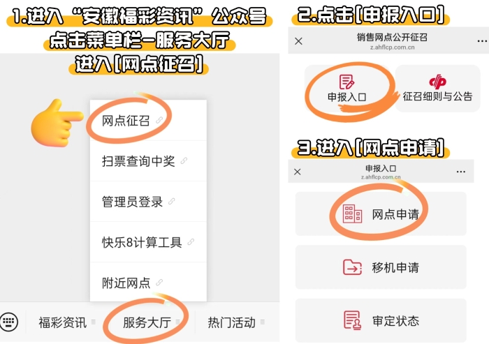 【第一步】线上申请:关注“安徽福彩资讯”微信公众号,点击“服务大厅”菜单栏中的“网点征召”进入申办平台。