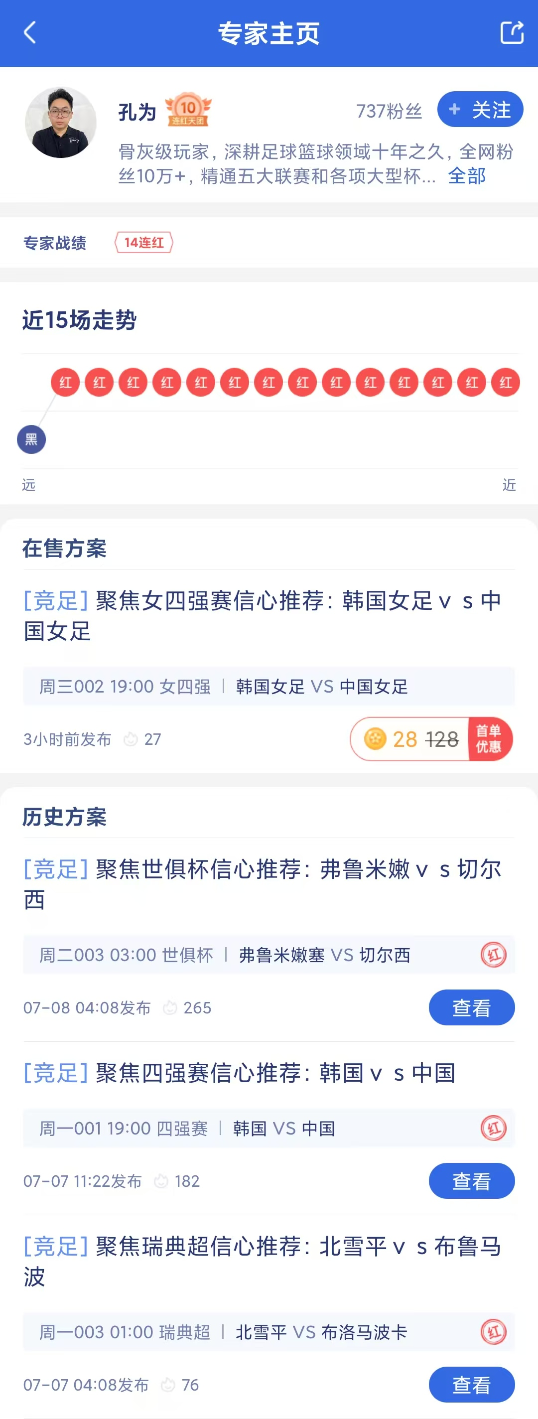 竞彩专家“孔为”昨日世俱杯成功命中,状态爆棚豪取14连红!今日最新推荐已更新,冲击15连红!