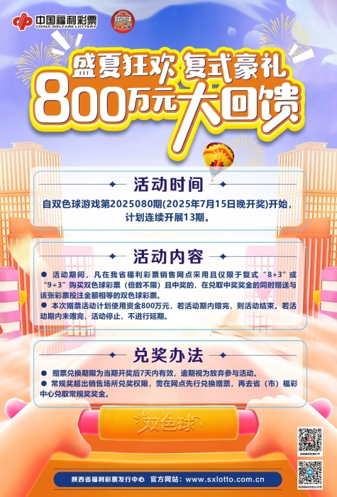 热情的天气和火热的活动,究竟会碰撞出怎样的火花?快快叫上小伙伴,拿好手中的双色球“8+3”或“9+3”复式票,一起搭乘这趟幸运专列,为盛夏时光增添一抹幸运色彩!