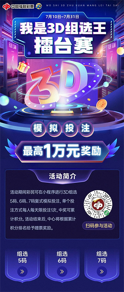 各位3D爱好者看过来,您有一份惊喜正待查收!7月10日起至7月31日,“我是3D组选王”擂台赛欢乐开启!