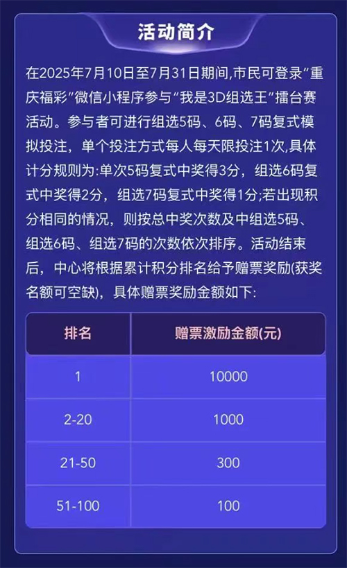 活动期间,参与者每天可模拟投注5码、6码、7码三种玩法各1次。5码中奖得3分,6码中奖得2分,7码中奖得1分。活动结束后,重庆福彩中心将根据累计积分榜对参与者排名进行统计。注:若出现积分相同的情况,则按总中奖次数及中组选5码、组选6码、组选7码的次数依次排序(获奖名额可空缺)。