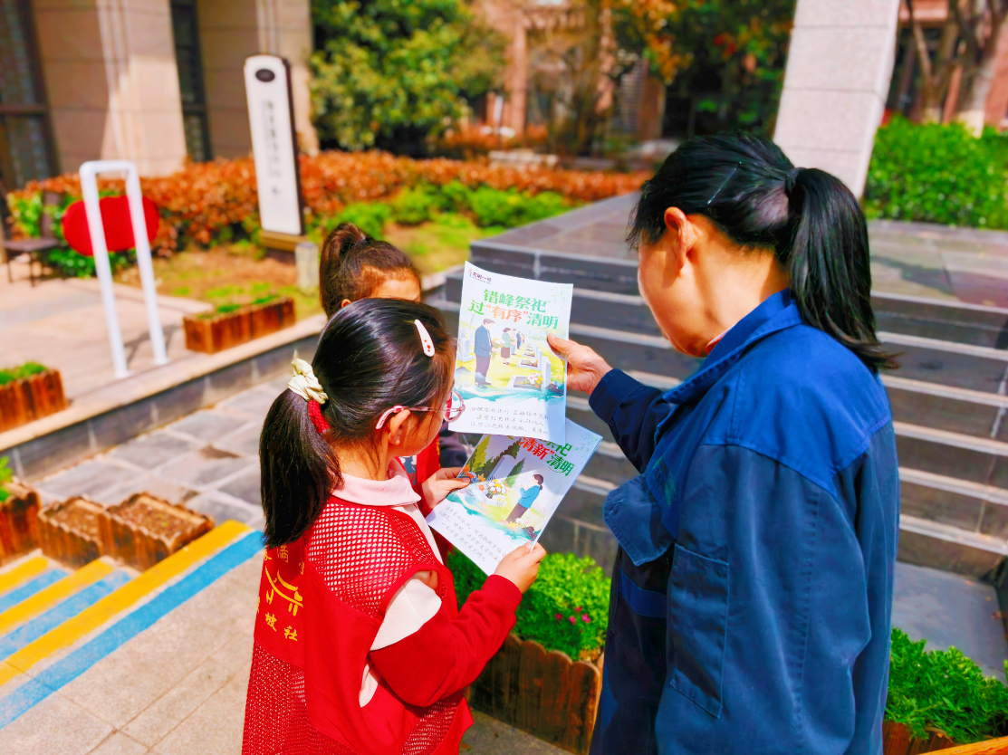 随后,小朋友们化身“小小宣传员”,在社区发放文明出行、错峰祭祀宣传单,倡导绿色安全祭扫理念,用童声传递文明新风。