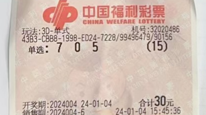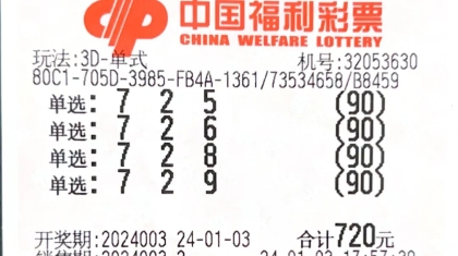 1月3日晚,福彩3D游戏第2024003期开出中奖号码“7、2、9”,...