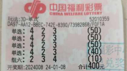 1月8日晚,福彩3D游戏第2024008期开出中奖号码“4、2、3”,...