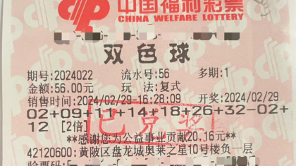 2月20日晚,中国福利彩票双色球游戏第2024018期开奖,开出红...