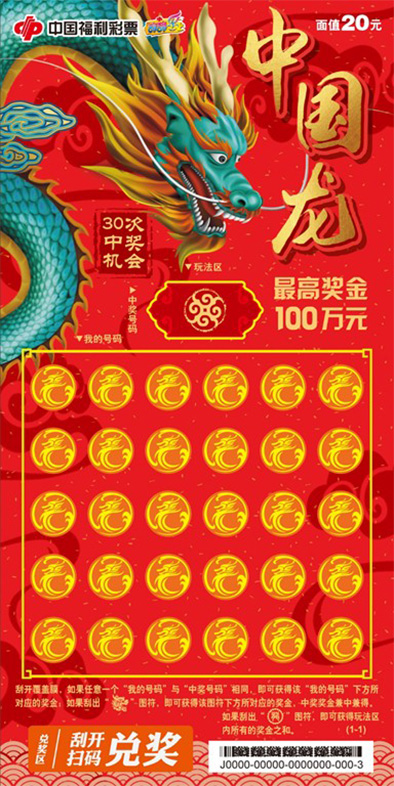 每包“中国龙”系列彩票,附有一张抽奖卡。用户通过“福彩刮刮乐”微信公众号,进入“中国龙”活动首页,绑定手机号后,扫描抽奖卡上的二维码,参与扫码抽奖活动,100%中奖。