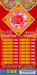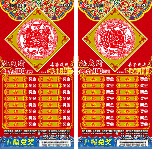 该款彩票使用饱和度极高的大红油墨与金色油墨印刷,点缀丰富的彩色纹饰,带给彩民强烈的视觉冲击;票面以剪纸为主题,票面中小猪与喜鹊嬉戏,寓意“猪年喜事连连”,充满浓郁的祝福之感;彩票整体设计简洁明快、色彩饱和度极高、令人印象深刻。
