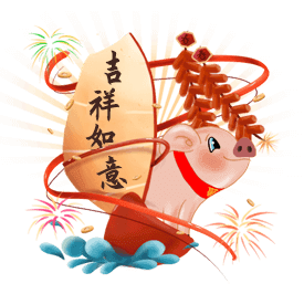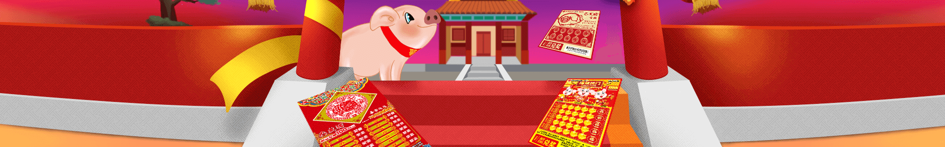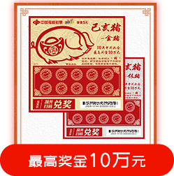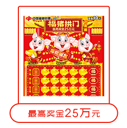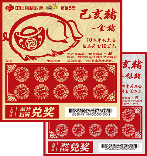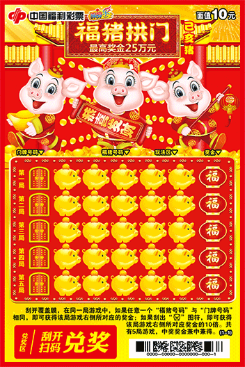 彩票取材于中国传统生肖文化,为2019年猪年主题彩票。画面中形体饱满、憨厚可爱的三只福猪造型生动、热闹喜庆。彩票再以玩法区进行总体布局,烘托出红火、欢快的节日氛围。寓意福猪送福运。