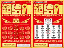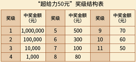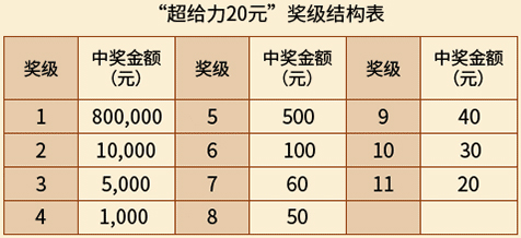 - 活动期间,对兑取“超给力”系列即开票游戏1万元及以上奖等的购彩者进行派奖,每个奖等的派奖金额等于相应奖级的设奖金额。