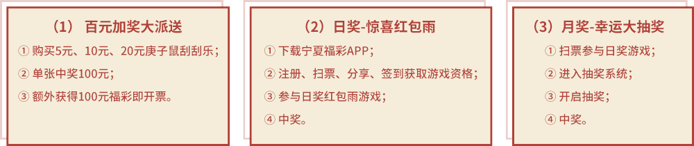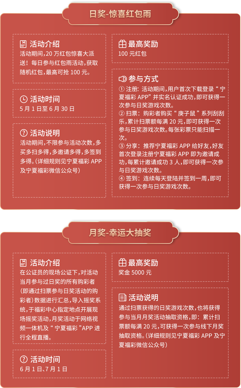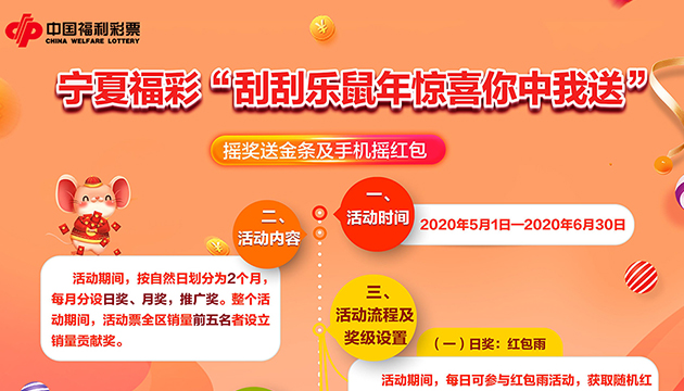 “刮刮乐鼠年惊喜 你中我送”是宁夏福利彩票发行中心针对“庚子鼠”系列刮刮乐重点打造的“线上+线下”大型互动营销活动。购彩者购买“庚子鼠”系列刮刮乐单张中一百送一百元即开票。此外,通过“宁夏福彩”APP,凡购彩扫票每满20元,可参与红包雨有奖活动,惊喜好礼享不停。还能有机会赢取金条及现金大奖,更有机会获得“走近刮刮乐”活动资格。一次购彩,四次中奖机会,海量福利等您来拿!