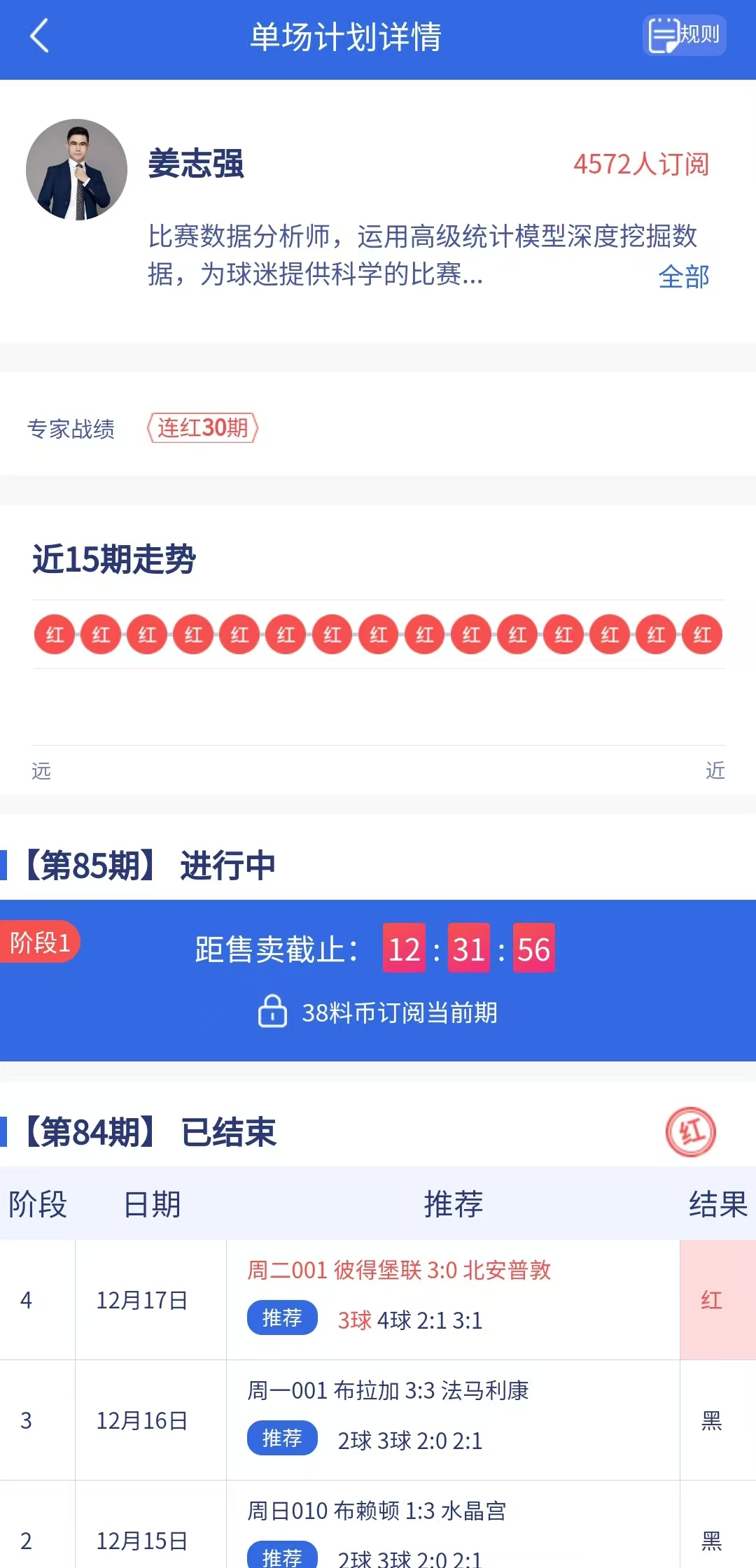 单场计划专家“姜志强”昨日计划成功命中,目前已经连红30期!今日最新单场计划已更新,稳定收益中,快来跟上!