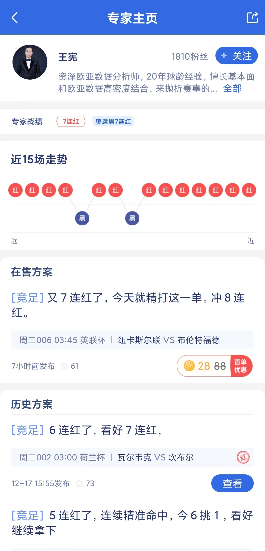 专家“王宪”每日精挑细选,近期拿下7连红!今日继续带来精选推荐,冲击7连红!不要错过连红好机会!