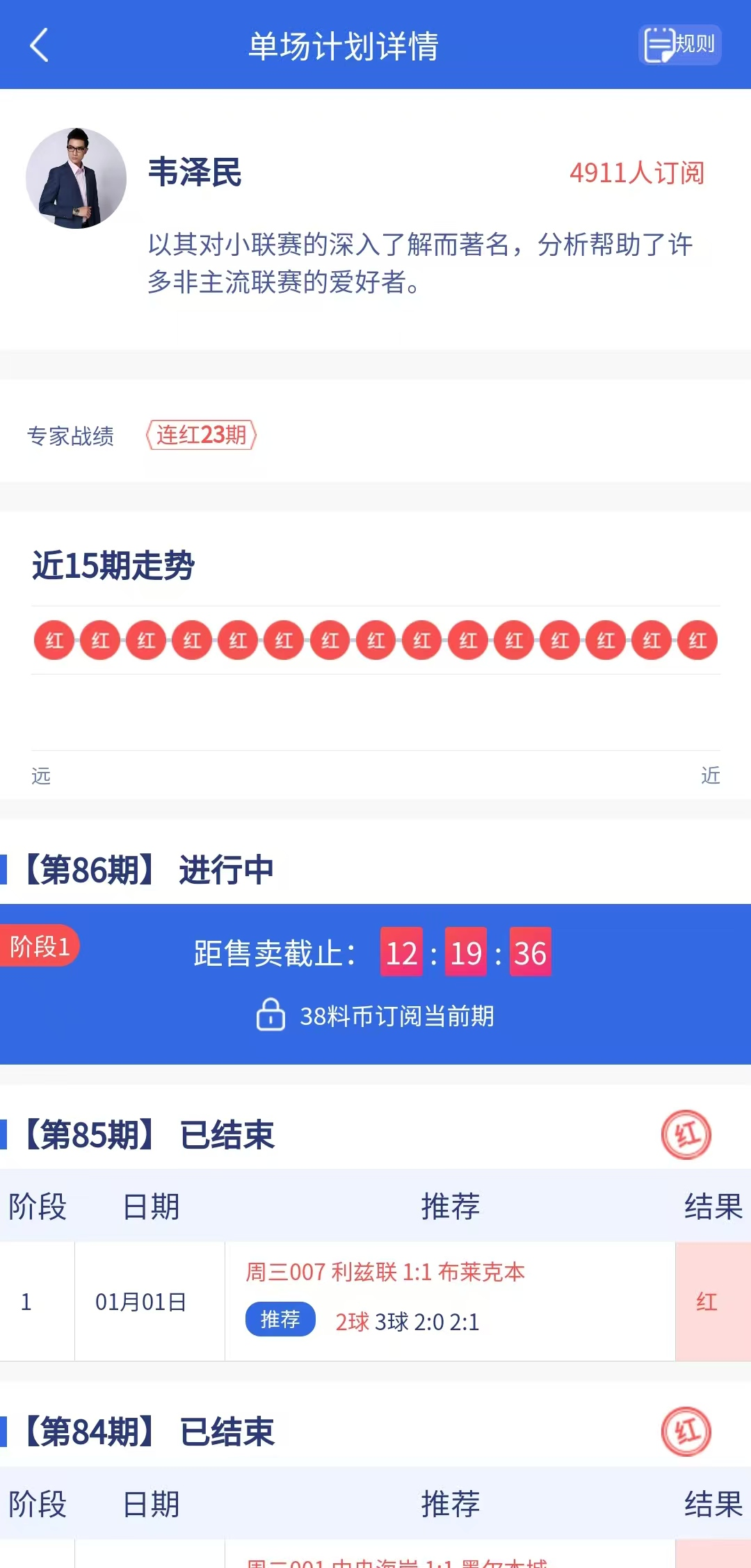 单场计划专家“韦泽民”昨日推荐成功命中,目前连红23期,状态相当出色!今日最新计划单已更新,稳定盈利中,不要错过!
