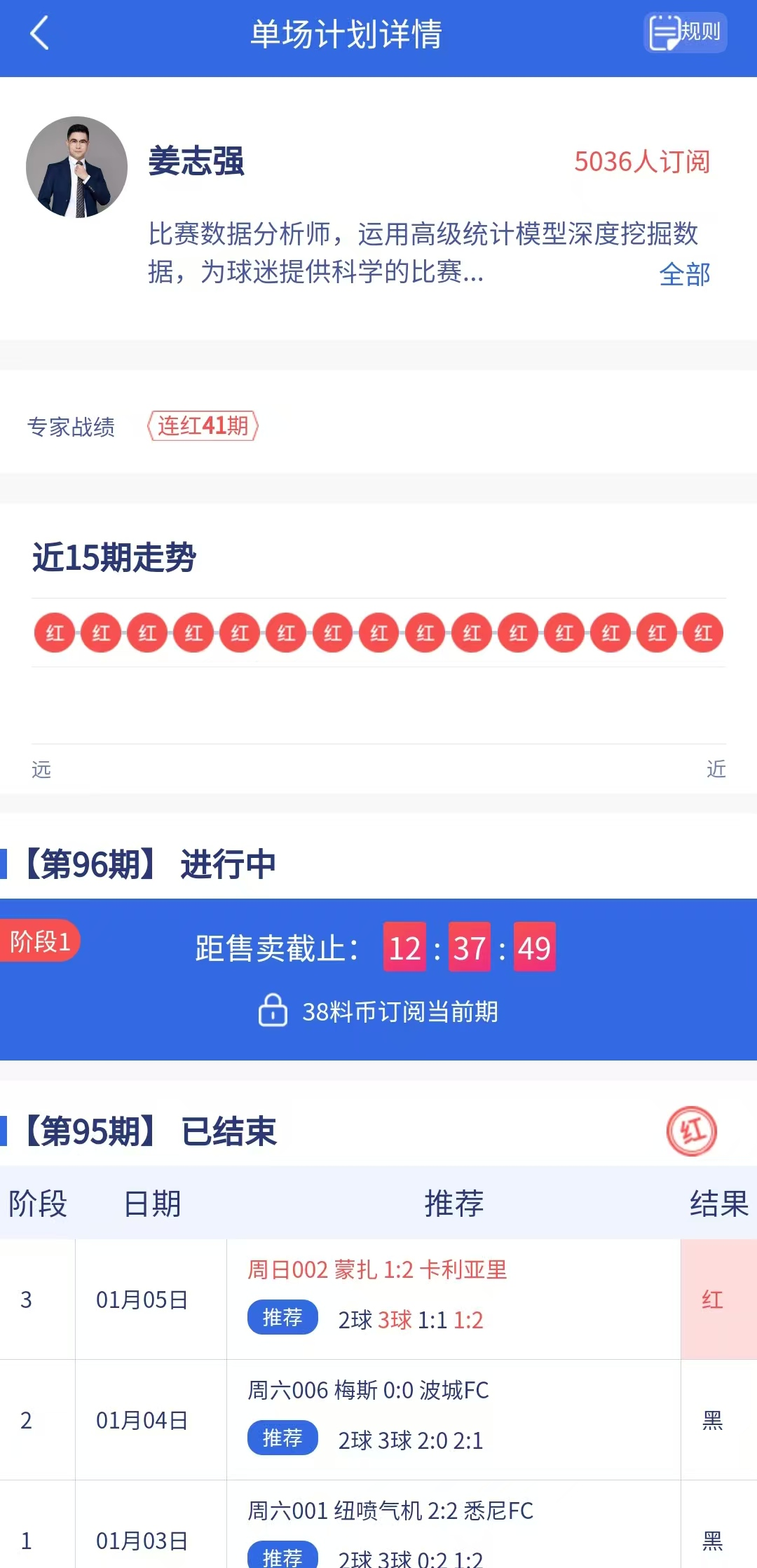 单场计划专家“姜志强”周末再次命中比分,目前已经连红41期,状态爆棚稳定盈利中!今日最新计划单已出,不要错过!