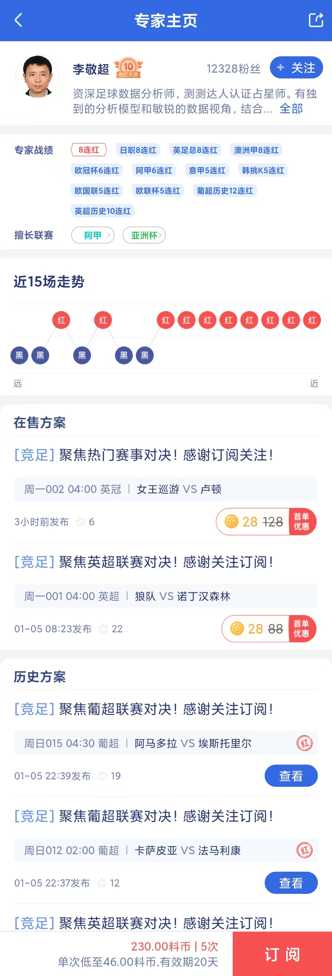 竞彩专家“李敬超”周末状态也是相当出色,成功拿下8连红!今日精选方案已更新,冲击10连红!