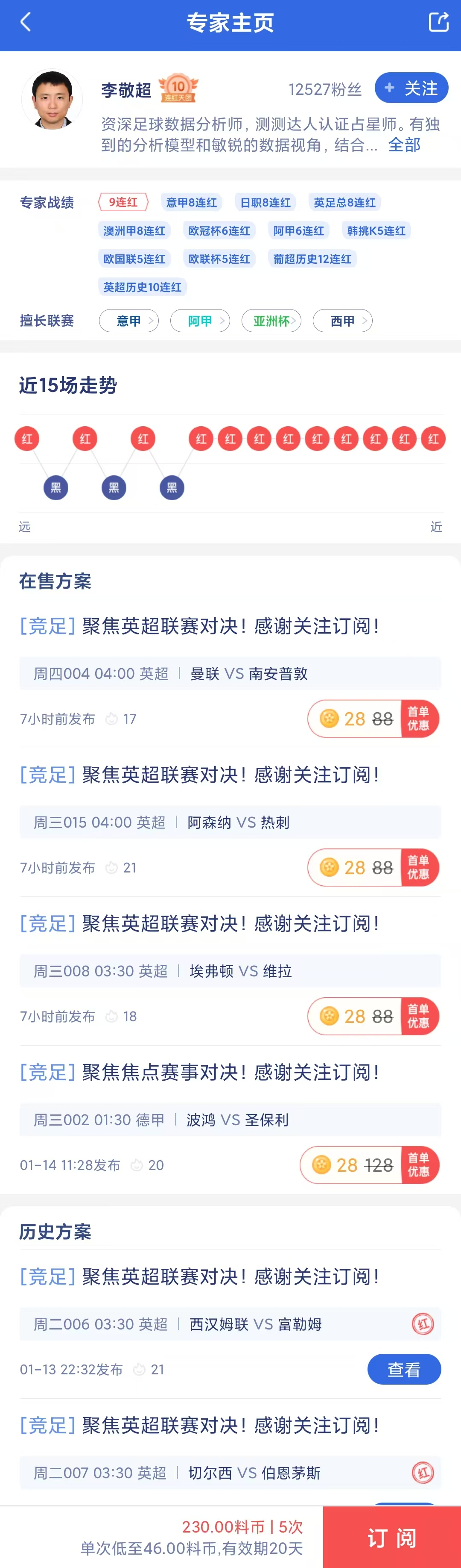 竞彩专家“李敬超”在冷门夜推荐全部成功拿下,豪取9连红,状态爆棚!今日精选方案已出,订阅更划算,不要错过!