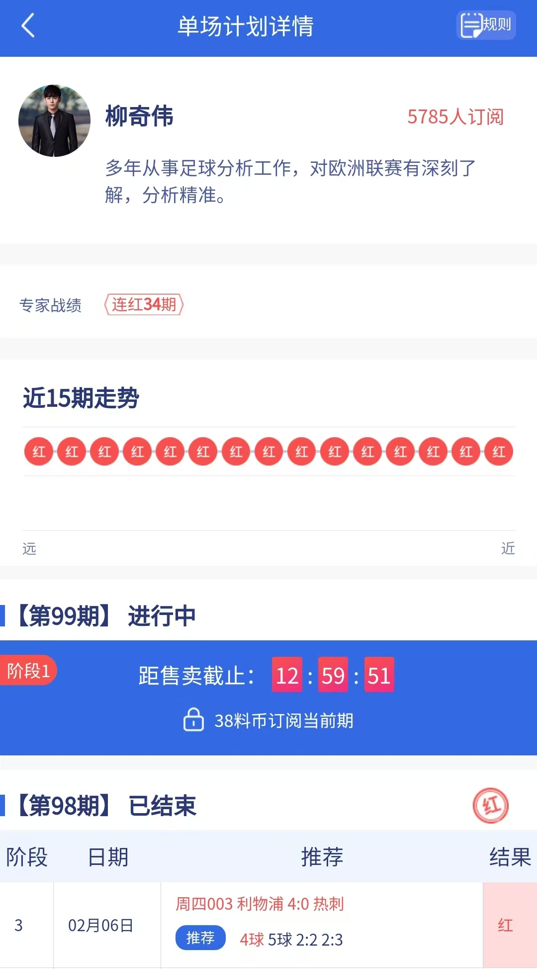 单场计划专家“柳奇伟”昨日计划成功命中,目前已经连红34期!今日最新计划单已更新,冲击35连红!快来跟上大神连红脚步!