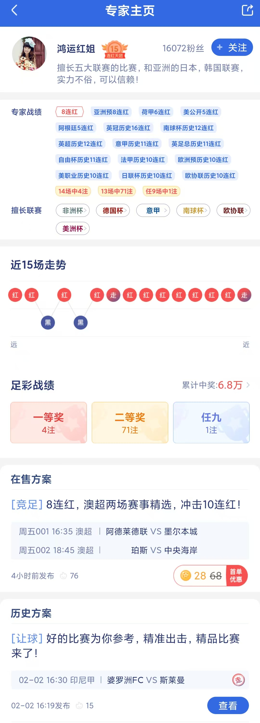 竞彩专家“鸿运红姐”状态正佳,目前收获8连红!今日带来澳超2串1推荐,不要错过收益好机会!