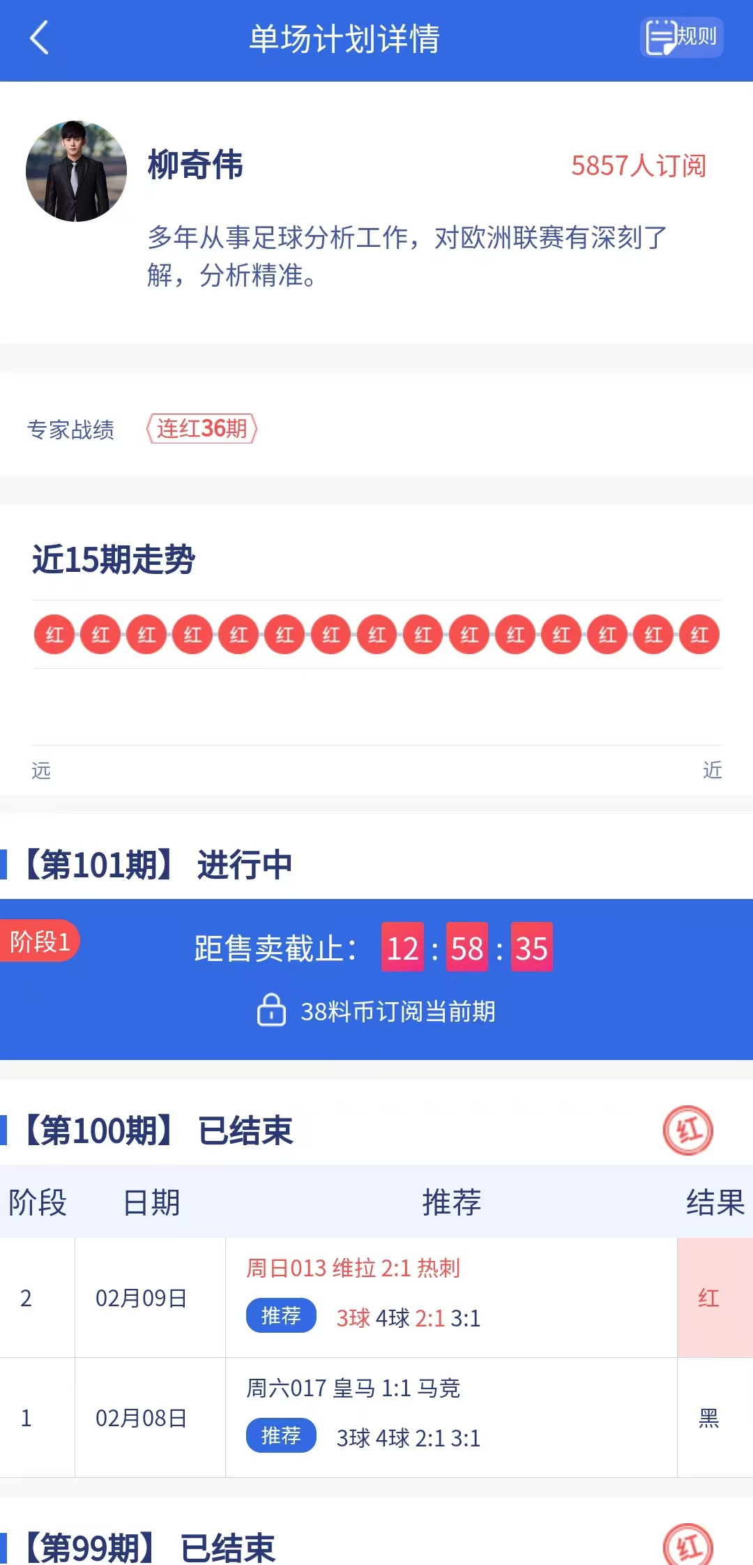 单场计划专家“柳奇伟”目前连红36期,近两期均是命中比分和总进球,状态极佳!今日最新计划单已更新!跟上一起收益!